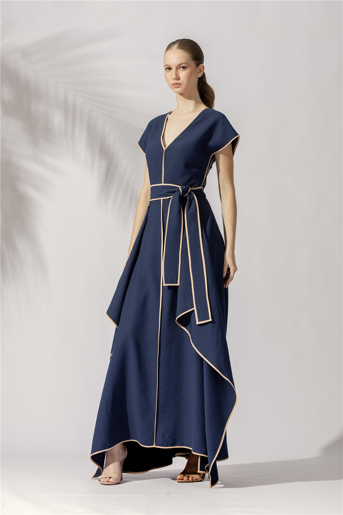O vestido Riva apresenta modelagem over midi e solta, proporcionando um visual elegante e confortável. Possui decote tomara em V, detalhe de faixa ajustável que destaca a cintura e barra com pontas assimétricas, adicionando movimento ao look. O viés tom contrastante confere criatividade e sofisticação, tornando-o ideal para ocasiões especiais ou eventos ao ar livre.